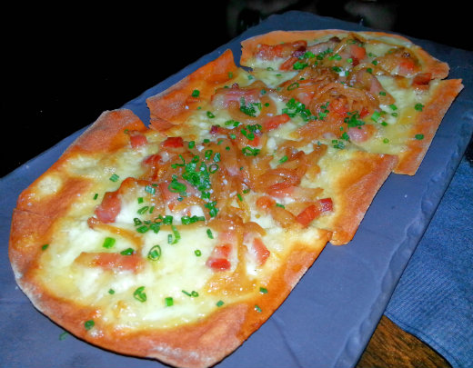 A classic French style tarte, which is a very thin flat bread topped with creamy white cheese, caramelized onions, bacon lardons and topped with fresh chives. I wouldn’t expect to eat this dish as a meal, but rather as something to munch one while enjoying a cocktail or with other small plate items. I loved the crispness of the crust against the gooey cheese and salty lardon. $9