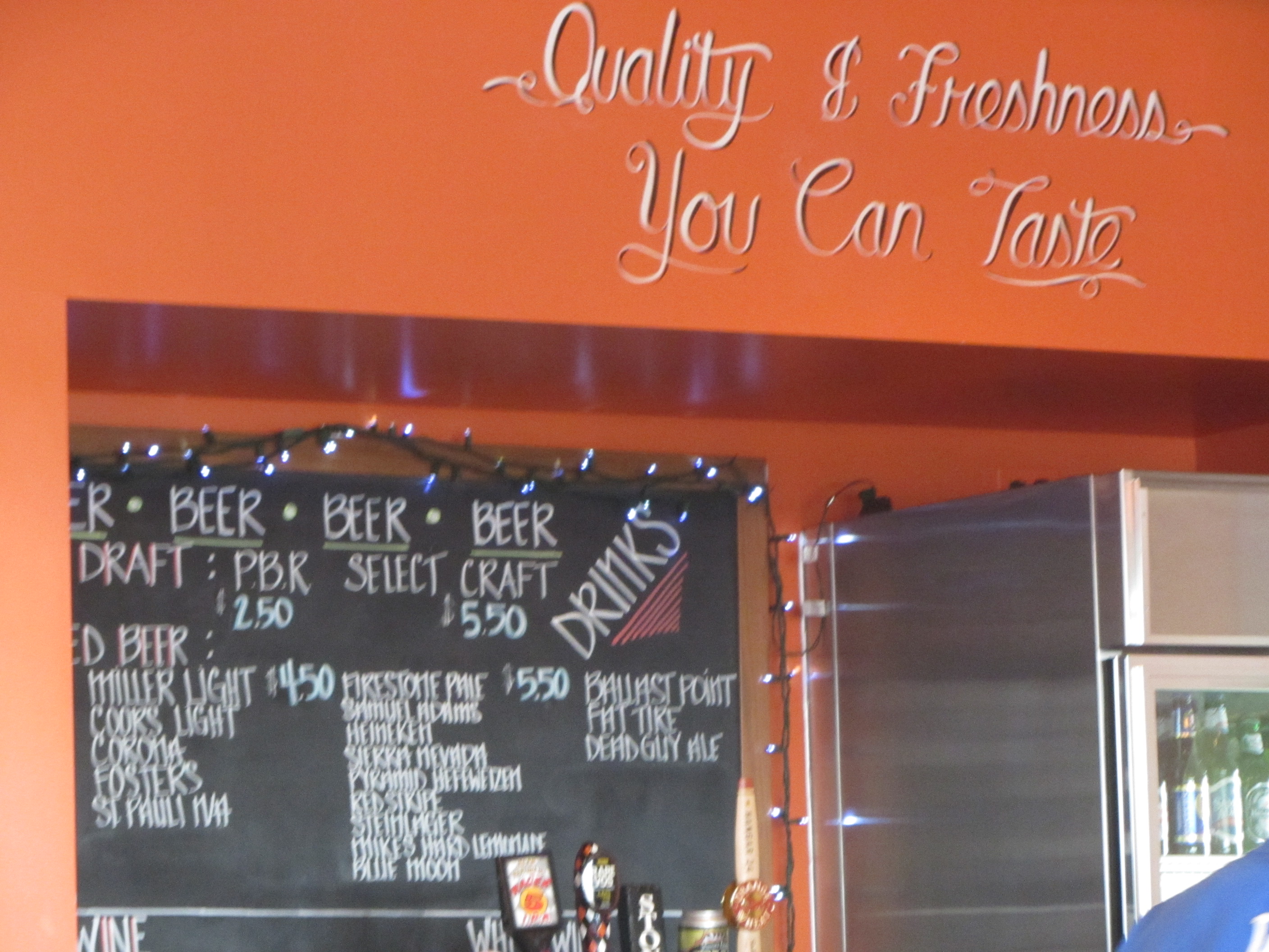 Shakes - I was too full to try their shakes, but apparently they are really good based on the reviews of two of my readers. They are made from hand scooped ice cream and milk. You also have the option of making it a malt for 50 cents extra. Draft Beer- Deemer’s also had a pretty impressive draft beer selection, here are the beers on tap the day I visited. Notice that they are all micro brews with great reputations: Racer 5 IPA, Arrogant Bastard Ale, Stone Smoked Porter , Hanger 24 Orange Wheat, Prankster, North Coast. I tried the Hanger 24 Orange Wheat and it was tasty.
