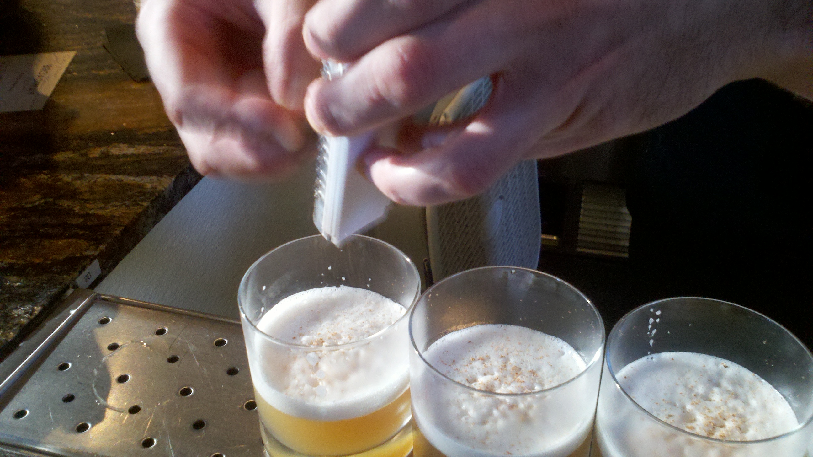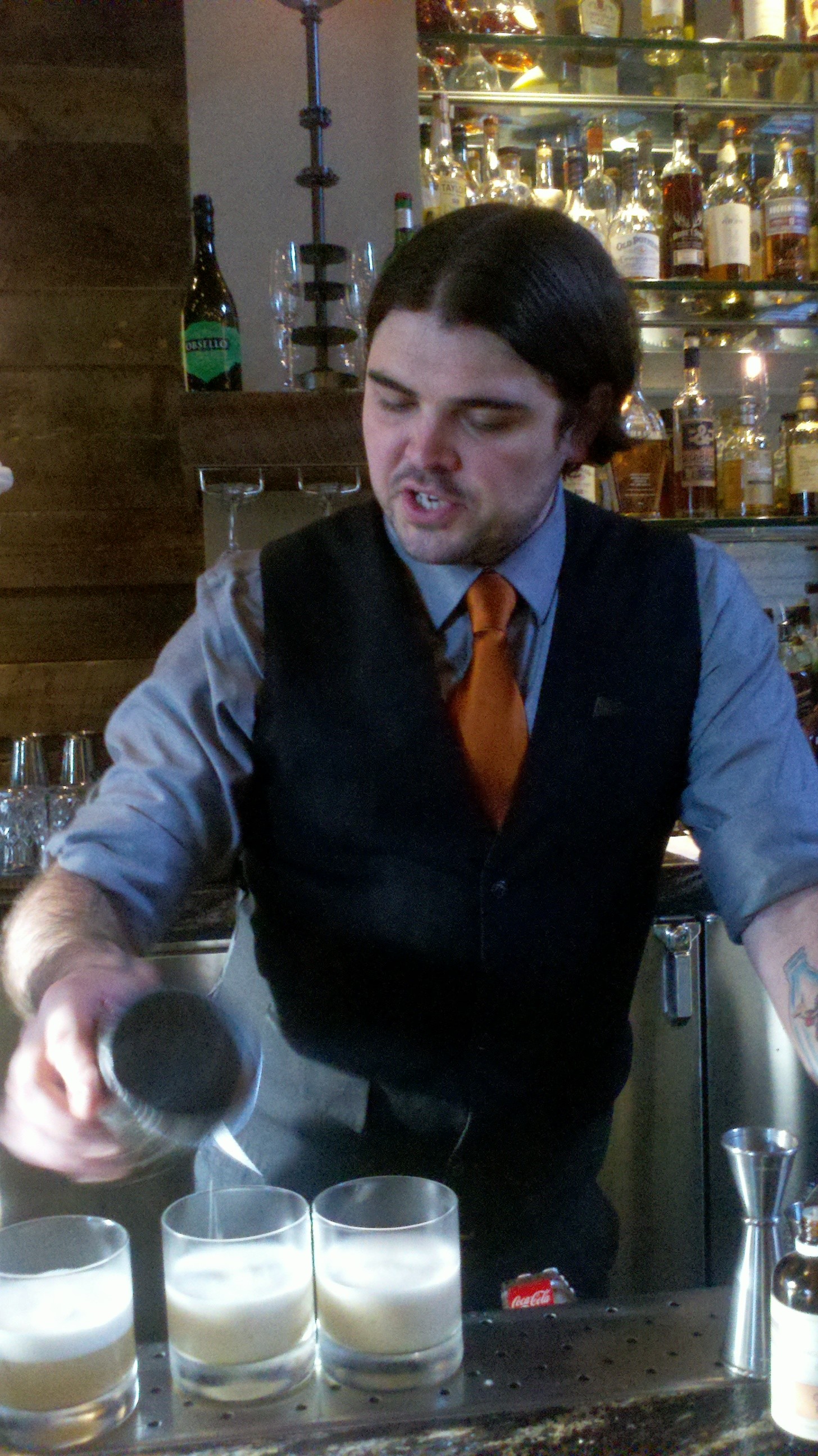 Ricky Yarna first made us his variation on a classic “fizz” style drink, called “Bank’s Closed.” It is made with Rittenhouse Rye, Amaro Meletti, freshly separated egg whites, fresh ground nutmeg, toasted pecan bitters, with an aromatic tease of lemon juice. Woah! You may say that’s a lot of ingredients! This drink is an example of true craftsmanship, as Ricky Yarma skillfully uses the ingredients to create a deceptively strong cocktail dressed up in herbal, citrus and spicy flavors. The drink has a nice meringue head from the egg whites.