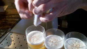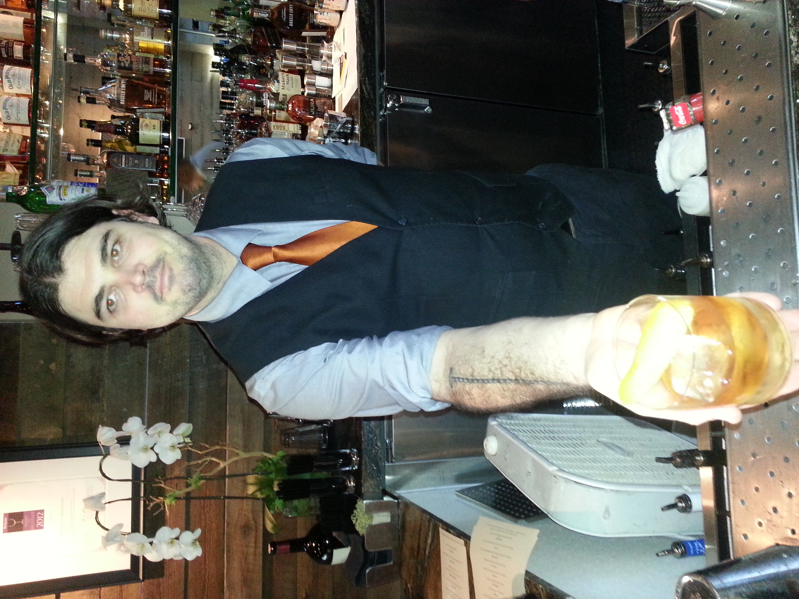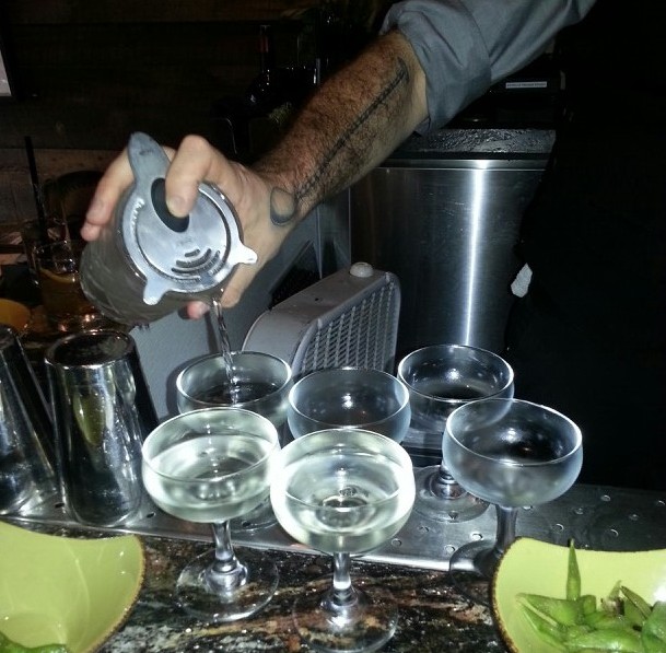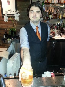 Chef’s Killjoy – I think it was named because it would kill a chef’s dish if paired incorrectly. This drink is make with Fernet Branca, ginger, lemon and soda. What is Fernet Branca, you may ask? It is similar to Benedictine or Amaro. This liquor is said to have the flavors of “medicine, crushed plants and bitter mud” – it is the Italian version of Jaggermeister. After my first sip, I was daydreaming of running naked through the forest to catch a date with a pine tree. When I woke up, I was sipping a very dramatic and delicious drink that has strong hints of pine and sweet ginger and the effervescence of soda. I would enjoy this drink immensely with kale and bacon crisps. If you start having daydreams of making love to an evergreen, time to call a cab!
