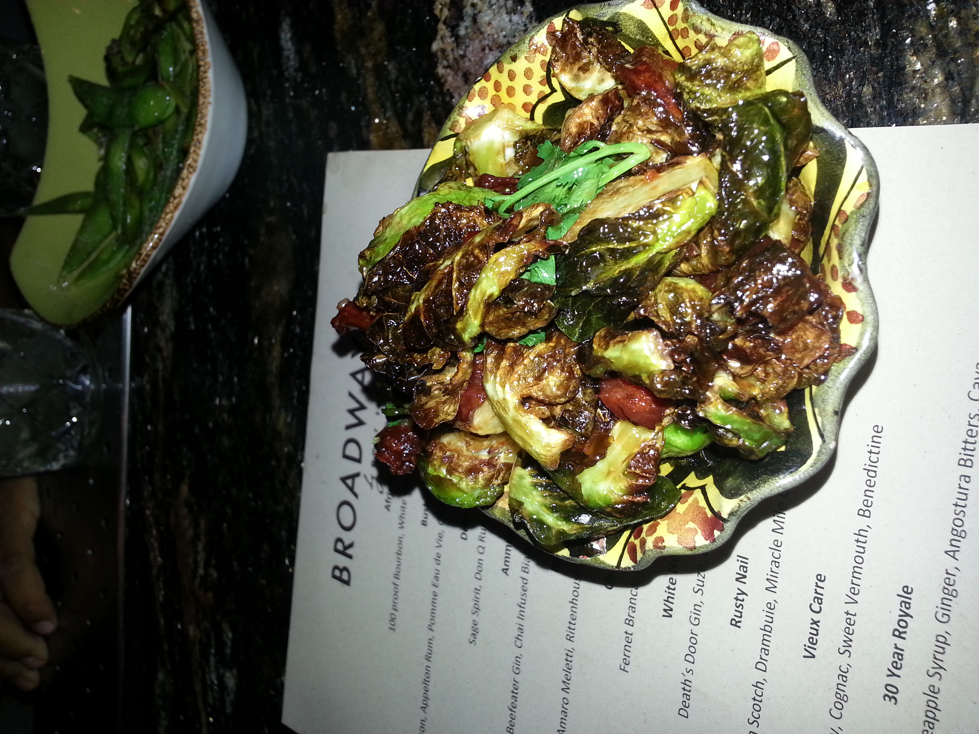 Brussels Sprouts — Like many of us, we were told, “you cannot leave the table until you finish your brussels sprouts.” Times have changed; now Chef Santana is showing us how to properly make Brussels sprouts. These muthas are made with a secret sauce , cilantro and Chinese sausage! Dang!
