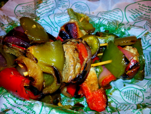 In addition to the make your own dish, Garbanzo Mediterranean Grill also serves fire roasted chicken and beef kabobs. They are served with green and red peppers. The meats are marinated in their secret rosemary sauce, grilled, and served on a bed of seasoned rice, vegetables and hummus. Kabobs cost $9.99. They also offer salads that run $6.99 - $7.49.