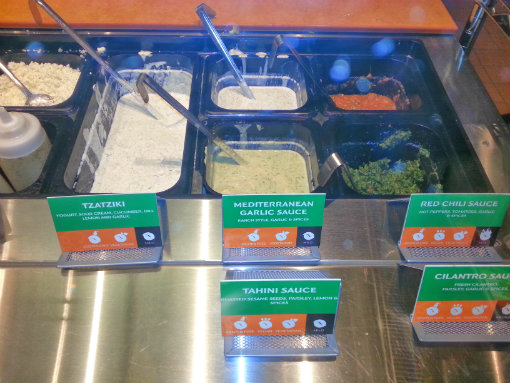 You also have your choice of sauces served in your dish or on the side. You can get as many of the sauces that you want, so I personally recommend that you get them all. The sauces available are tahini, Mediterranean garlic sauce, red chili sauce, and tzatiki.