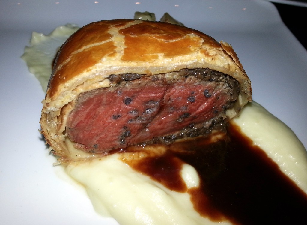 A classic continental dish that has made a strong comeback to mainstream restaurant culture, thanks to Gordon Ramsay’s obsession for perfection on Hell’s Kitchen. It is made by coating fillet mignon in a mushroom paste called a duxelle, thin layers of prosciutto and then tucked into puff pastry. The wellington was served with a garnish of glazed carrots, potato puree and red wine demi-glace. The Chef nailed the execution of this dish with a perfect medium-rare temperature and golden brown pastry. When I ate the Wellington, I was giddy from the flavor combinations. This was a very exciting dish.