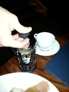 A clever presentation of coffee and slightly bourgeois in style! Our coffee was French pressed table side and was presented with three chocolates spoons labeled A, B, C. Each spoon contained a coffee friendly liquer, Amaretto, Bailey’s, and Kahlua (yes, they cheated on the C). You simply place the spoon in your coffee, and let the flavors of the chocolate and liquor blend into the coffee. Brilliant idea!