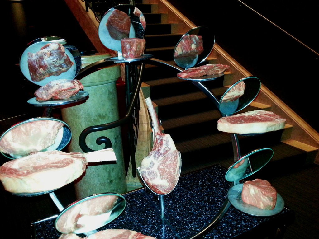 You get to know your steak, by looking at it in it’s raw form. Your waiter rolls out a wheel of meat table side so that you can learn about the size, marbling and color of the meat your are ordering. A couple of the cuts of meat that caught my attention were the American Kobe rib cap, royal long bone Chop, and my favorite the rib-eye.