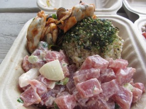 Their poke comes in six different flavors and the flavors change daily (I know this fact because I visited at least 3 times while we were there!). One of my and my wife’s favorite flavors of ahi poke was called “Dynamite,” which was made with pureed avocado, onions, soy sauce, and a mildly hot spice. The “Kileau” was a spicy poke made with chilies, sweet soy sauce and sesame seeds. This poke variation had a slow ambient sizzle that provided a pleasant zing to compliment the fish. The “Sweet Sesame” was a nice combination of salty (soy), sweet (sugar), and nutty (sesame seeds and oil). This combination really made the fish flavor pop out. IMPORTANT! Be sure to request samples; the staff is extremely friendly and wants to help you pick the right poke for your preferences. I tried all 6 types before I decided.