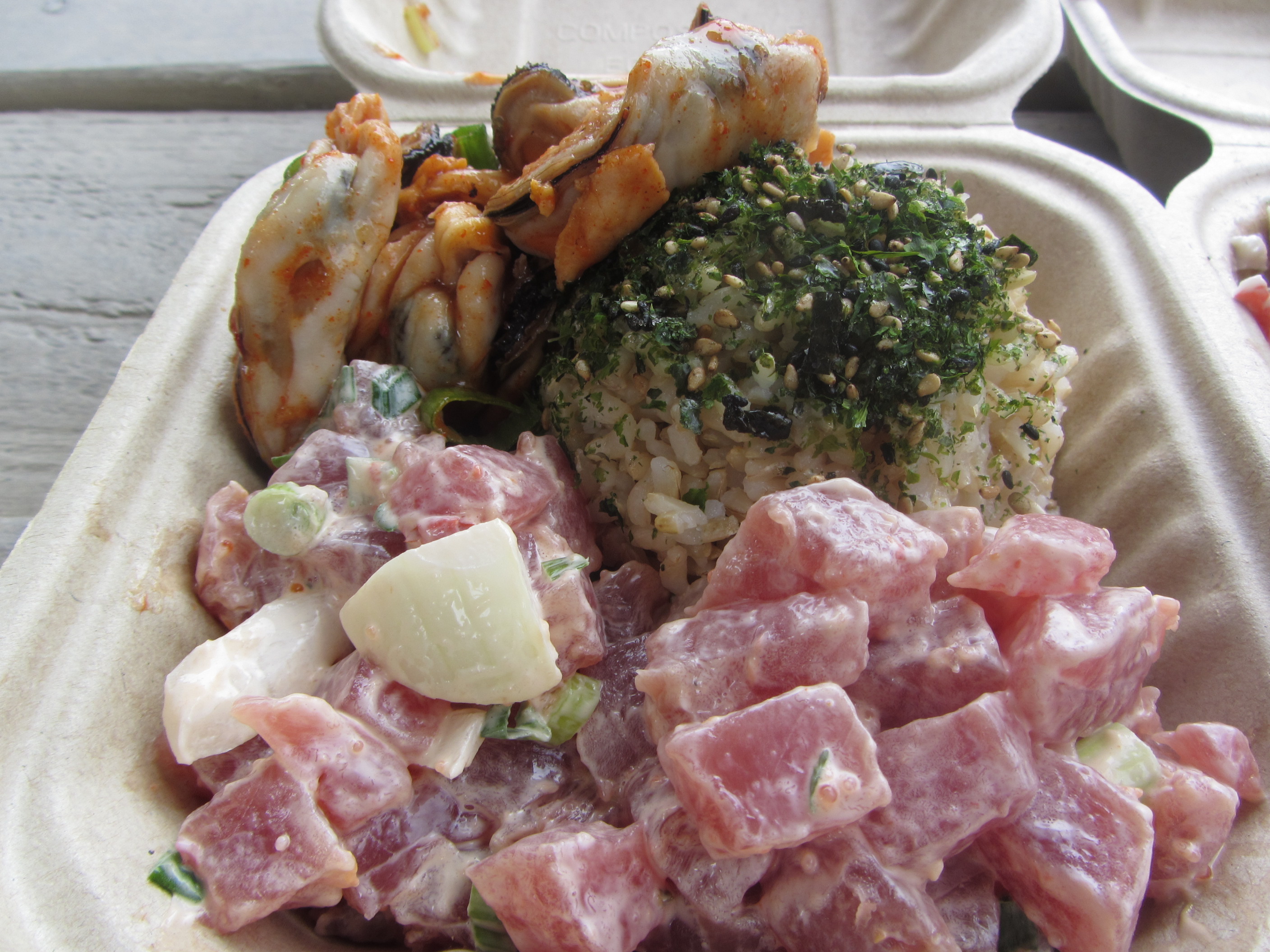 Their sides are as impressive as their poke. Your choices include the standard Hawaiian-style potato-and-macaroni salad, although their best sides are the pickled seaweed salad and kimchi mussels. The mussels were fresh and the kimchi made the dish spicy like a Kardashian sister. I also recommend that you request the furikake (salty seasoning, sesame seeds, and chopped dried seaweed) be sprinkled on your rice….it really sets off the flavors.