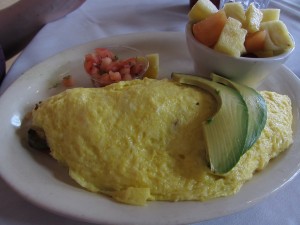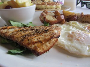 t pancakes. This is one of the times I’ll admit my wife’s ADD behaviors paid off and lead to an excellent discovery. So of course you can guess what my wife ordered: macadamia nut pancakes. I ordered one of their daily breakfast specials, which included fresh fish, eggs, and home fries. Yes, you did read that correctly — I did say fresh fish with breakfast. The fresh fish of the day was ono, and I had it with my eggs over easy! Yes!!!! To balance out the meal, my wife also got their garden omelet with goat cheese. The ono was seasoned simply, with salt and coarse grain pepper, and was extremely juicy.