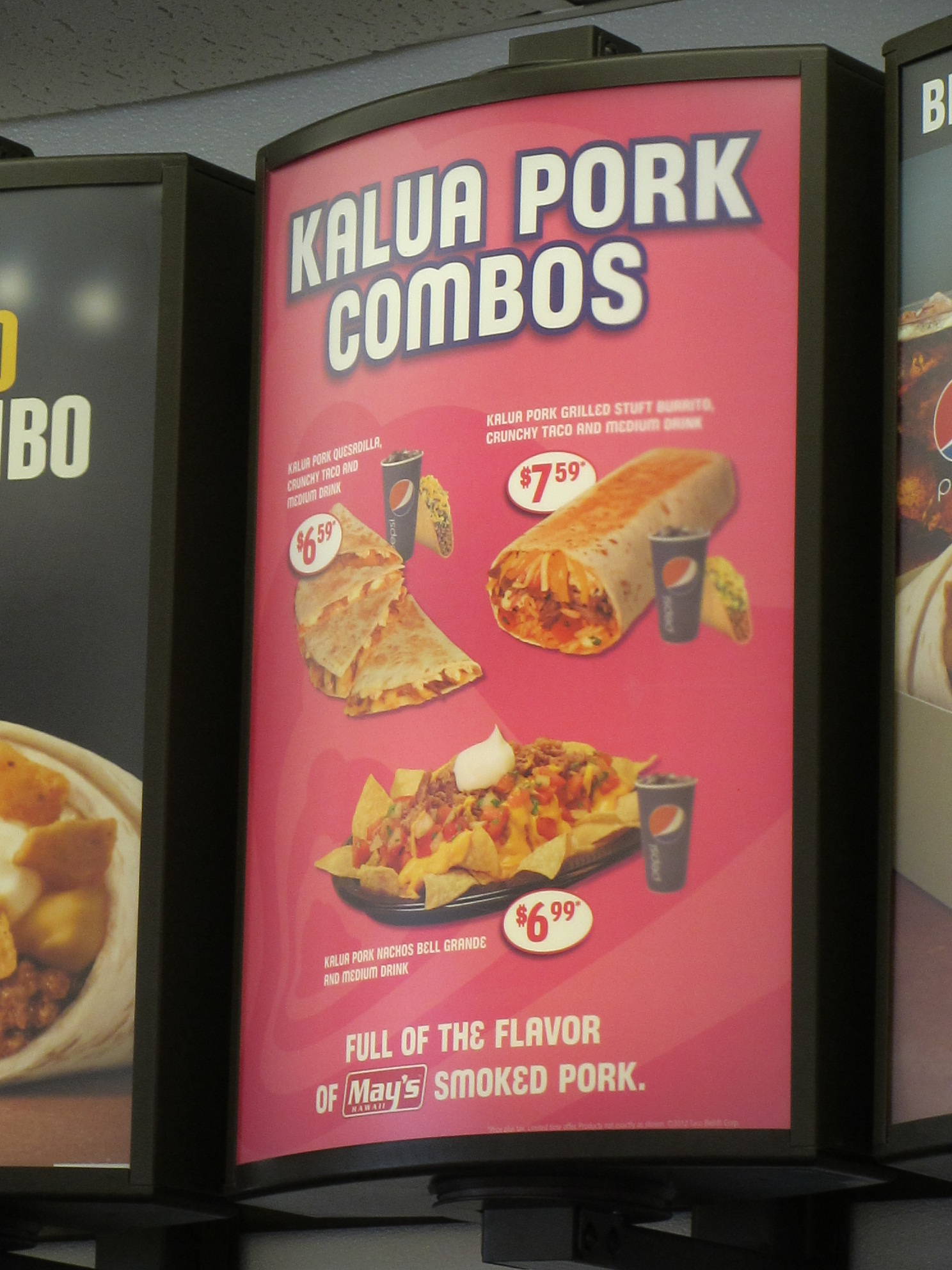 Yes, my fellow foodie snobs, I did go to Taco Bell in Hawaii! Again, don’t judge, I visited for the sole purpose of investigating their regional variations 😉 I was rewarded for my visit by finding their Kalua pork burrito and quesadilla. Obviously the Taco Bell version is not as good as freshly made kalua pork that you will find in a backyard Luau, but not bad for a Taco Bell.