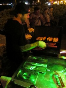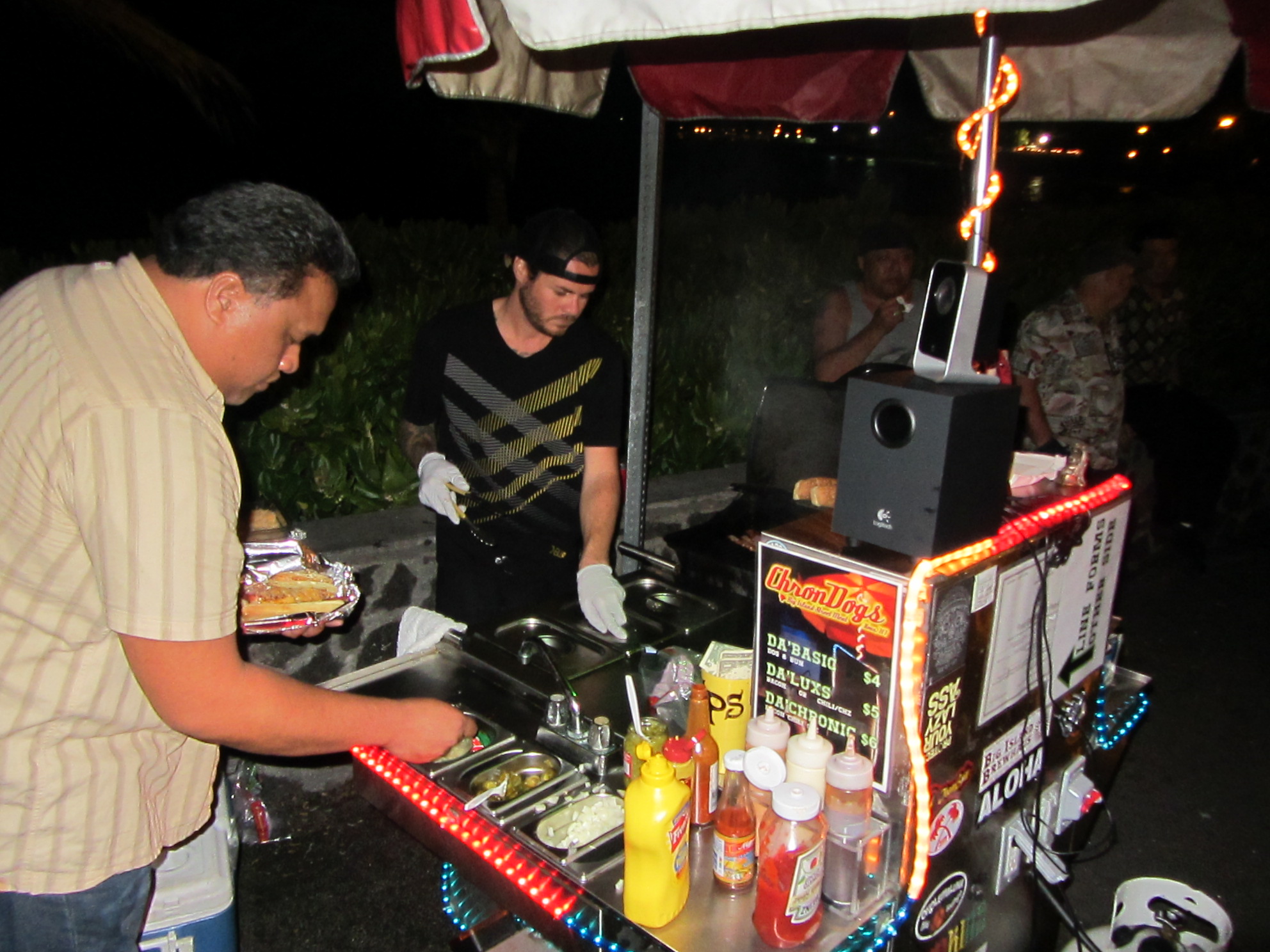 Look for mobile food cuisine staking out the bar scene — every city has them. Walking out the door of LuLu’s, what did I find? KronDogs! This mobile food vendor uses a push-cart grill and a blowtorch to cook hot dogs to the hungry drunken masses. The owner is a blonde surfer-looking guy with sleeve tattoos. We chatted and discovered that he is a fellow Orange County, California native, who moved to Hawaii several years ago.