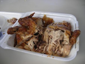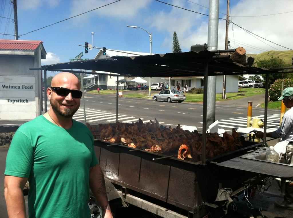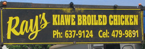 Another piece of roadside awesomeness was spotted by a friend who visited the Big Island, Hawaii a month before I made my trip. This account is based on an interview with Nachelle Corey, who says this place provided the “best chicken ever!” This roadside vendor sells freshly-broiled chicken from a large BBQ pit attached to the back of a trailer. Ray, the owner, racks whole chickens on metal skewers and slowly broils them over low heat, ensuring each rack of chicken is perfectly cooked.