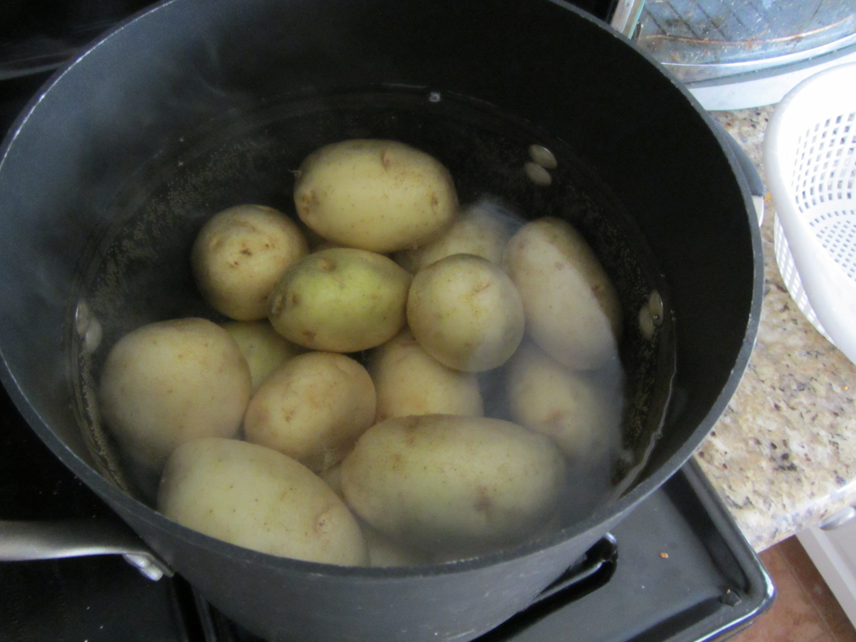 Fill large pot with the white potatoes, teaspoon of sea salt and bring to a strong boil. When you have a full rolling boil, reduce the heat to a simmer and let the potatoes simmer for 15 minutes.