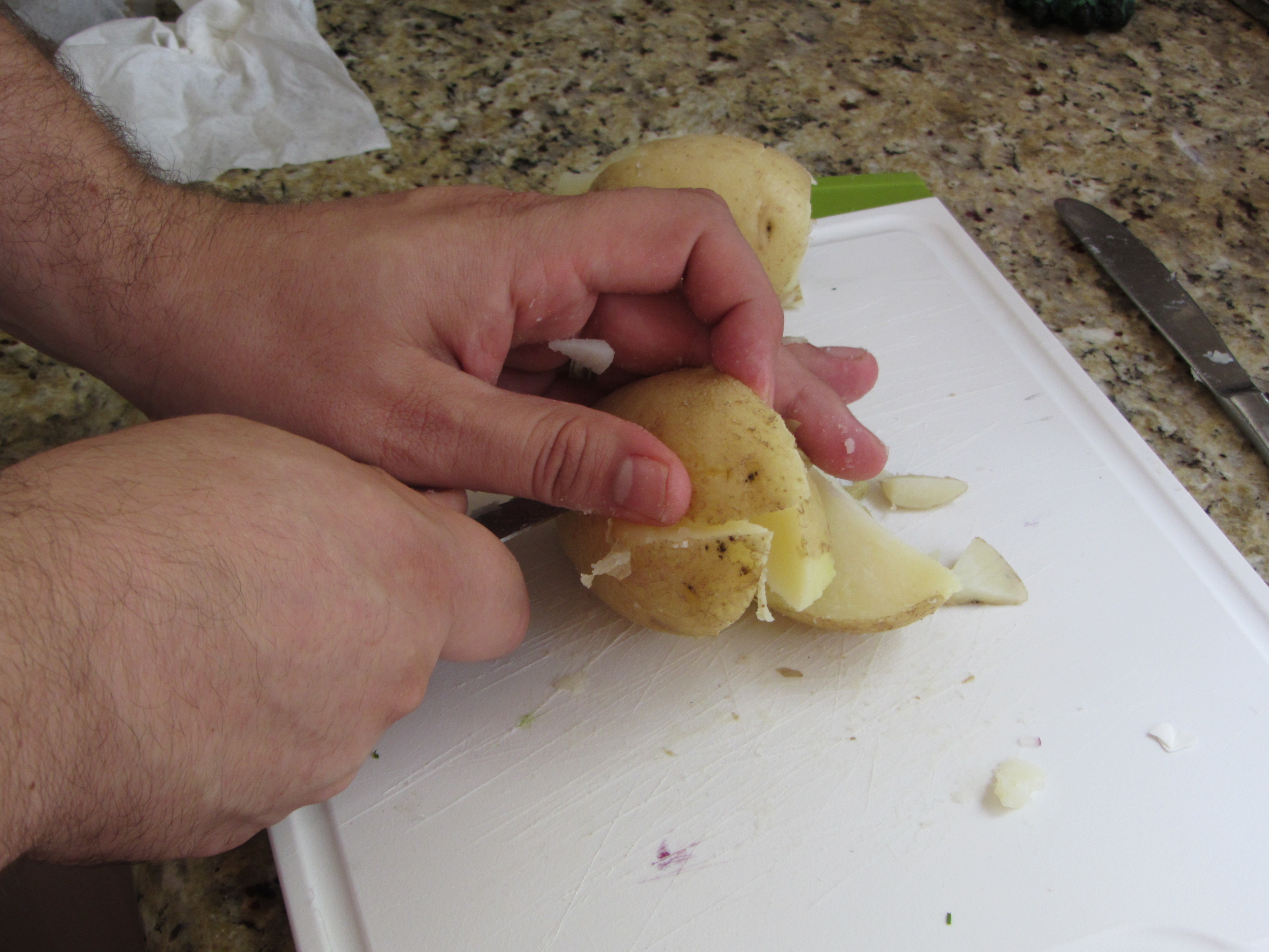 When potatoes are ready, drain them out in a colander and set it over the same pot. Allow the potatoes to “Steam Out” for at least 15 minutes. After that, you can lay them out to cool down. Once the potatoes are cool enough to be handled (YET STILL VERY WARM!), cut them up into your preferred size. I personally prefer my potato chunks to be the size of a quarter.