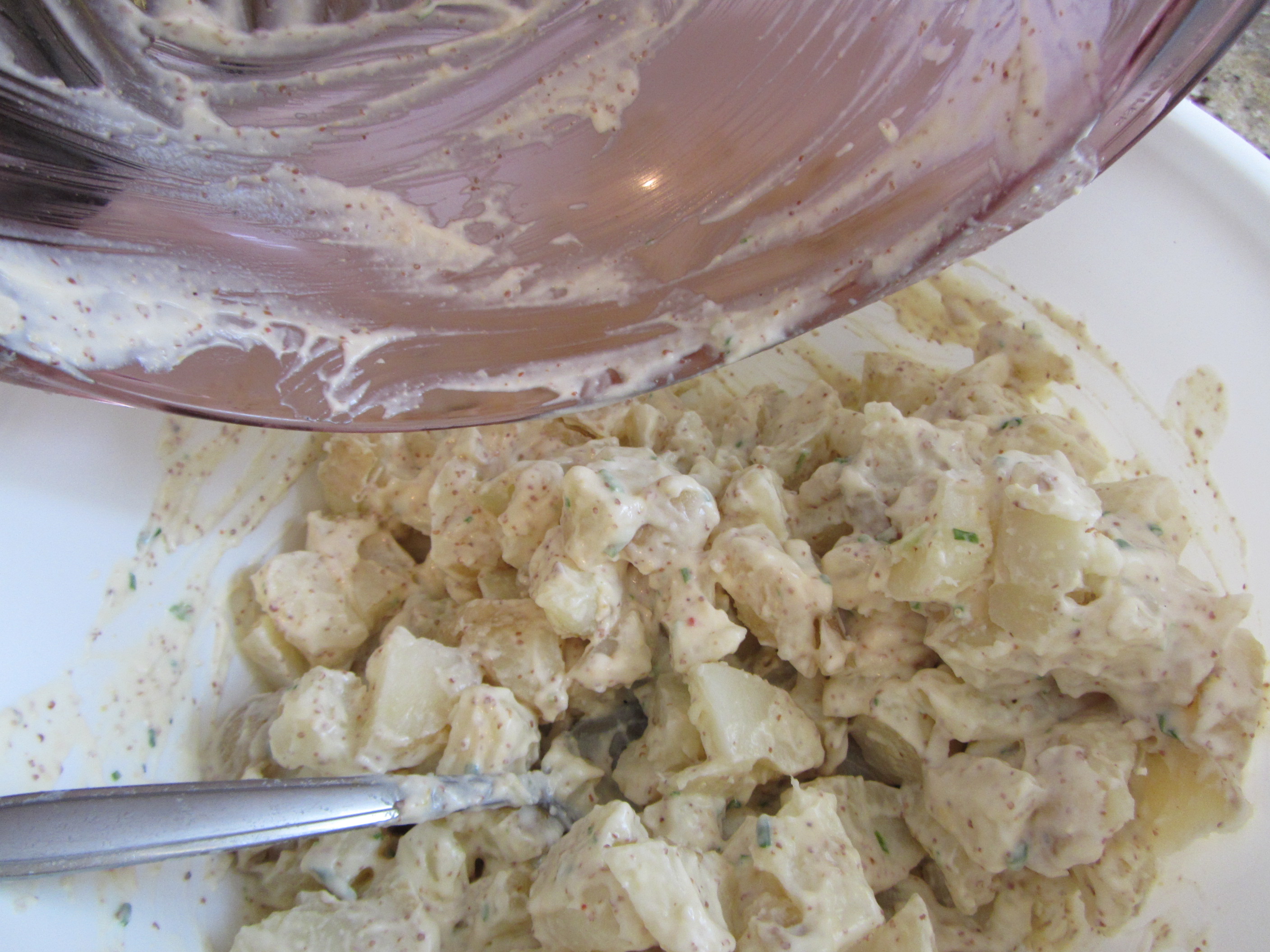Pour mixture over the cut up potatoes and mix thoroughly. The mixture should be added while the potatoes are still warm to ensure the mixture permeates , moistens and marinates the potatoes.
