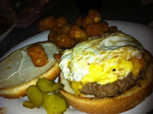 I ordered a burger with egg, chili and grilled onions. I’m not sure what everyone else ordered because I was too hungry and tired to notice. When the burger came out, it was big and steamy. It was large enough to require two hands. When I bit into the burger, it was juicy and extremely flavorful. The egg was cooked a perfect over easy, such that the egg and meat juices blended into a loving ooze that seeped down the side of my fingers…it was glorious. The chili cheese fries