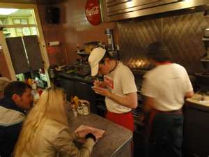 We made eye contact with the two guys we were chatting with and we all raised our hands at once! The sassy bouncer/hostess took us to our table and told us to enjoy our meal. Our transgender waitress came by to take our orders with sass and flare. We all ordered custom burgers and Chili Fries. Ordering their burgers was almost compulsory, as the smell of burgers and cheese cooking on the grill was intoxicating. Here I witnessed one of the more interesting cooking techniques that they employed, which was using hub-cabs from classic American cars to expedite the speed of cooking the hamburger patties