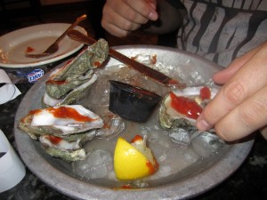 2) Dress up your oyster in condiments of your choosing. Typical condiments include horseradish, lemon, vinegar, shallots, mayo and cocktail sauce. I prefer my oysters with a dash of Tabasco and a light squeeze of lemon. Some folks prefer eating their oysters out of the shell naked…but to each his own.