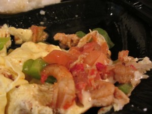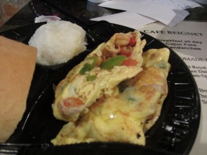 I was like, “No, No I’m not interested, my crawfish omelet is good and I don’t want to fill up.” Secretly I really wanted a bite.