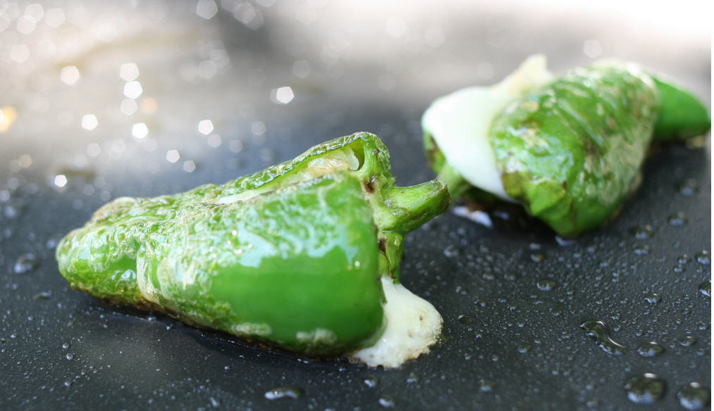 Padron Chile stuffed with cheese and sprinkled with Sea Salt. This preparation is popular in Barcelona. and you might just see it in the U.S. markets soon. Image from sunnyvaleglutton.com
