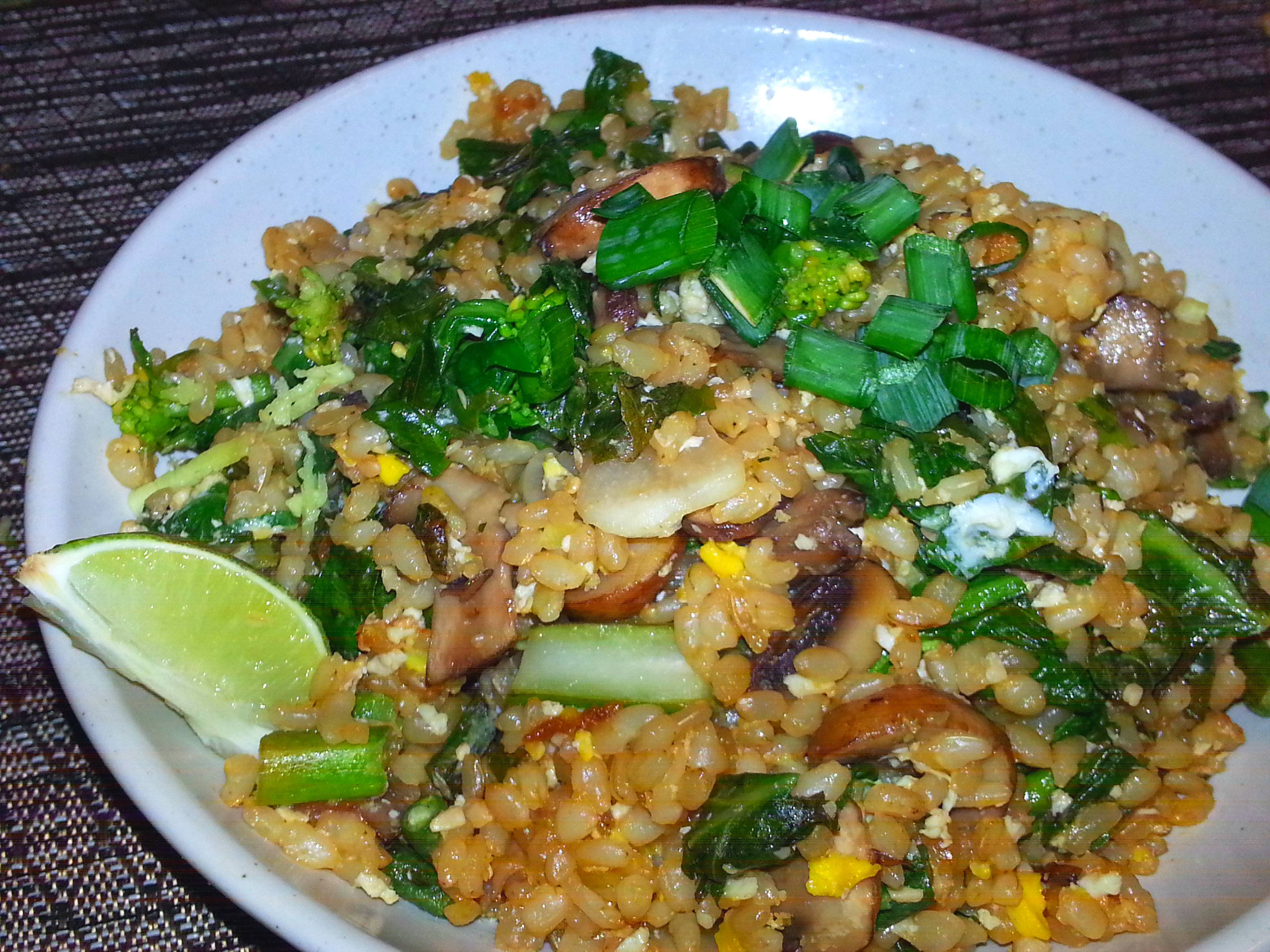 Serve the Healthy Fried Rice with green onion and quarter slice of lime.