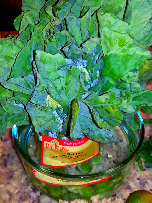 Gai Lan which is also known as Chinese Kale or Chinese Broccoli. This is the same stuff that is served sauteed with oyster sauce at Dim Sum. It is a leafy vegetable with thick, flat, glossy blue-green leaves with thick stems and a small number of tiny flower heads, like mini- broccoli. The flavor is slightly bitter. Gai Lan is high in fiber, Vitamin A and C.