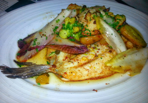 Loup De Mar is a Mediterranean Sea Bass with soft delicate flesh. The fish is filleted open and pan seared, skin-on, with pistachio butter . The pan sear gives the fish a rich buttery flavor that accentuates the natural flavor of the fish. It is served with fingerling potatoes, Riesling soaked raisins, cauliflower, baby endive. I like the flavor of the fish alone, but they taste wonderful with the accompaniments.