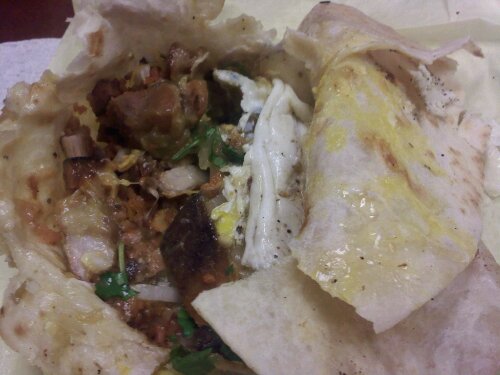 usion flavor, not just Chinese food forced into a tortilla. This was food porn, with flavors almost too obscene to talk about in polite conversation. While nearing the last 1/3 of my yummy “stoner burrito”, I hit the sweet spot of the burrito. Here at the last 1/3 of the burrito, the runny egg yolks had pooled up and congealed with chunk of Chorizo, Rice , Pork , cilantro , cheese and mixed meat juices. When I took a bite into the burrito’s G-Spot, I made the foodie “O face” and was left speechless. After food flush left my face, I started showing my co-worker the half-eaten burrito and said “…Dude!!! You have to try this!”. He looked at me with a “I don’t want your half-eaten burrito” look in his face”…