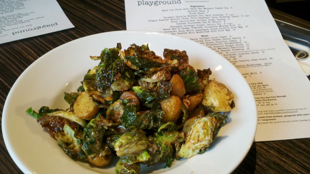 In 2011 I became a convert of the cult of Brussels sprouts, and since then they have peaked in popularity to the point that they have almost become uncool. Well, fuck that! I am not in high school and Brussels sprouts are here to stay. I eat them whenever I get a chance and have grown to really become a snob of these leafy green balls of crack. The Playground did not disappoint, and they even inspired me with their take on Brussels sprouts. The Brussels Sprouts were toasted (roasted or fried . . .I couldn’t tell) and tossed together with some baby dutch potatoes in a “mustard vin” sauce. The result was the nutty flavor of the Brussels sprouts being accentuated and complimented by the sweet and tangy notes of the sauce. This preparation ranks in my top five Brussels sprouts execution of all time. Sorry Mom, but your preparation did not make my top 10 list.