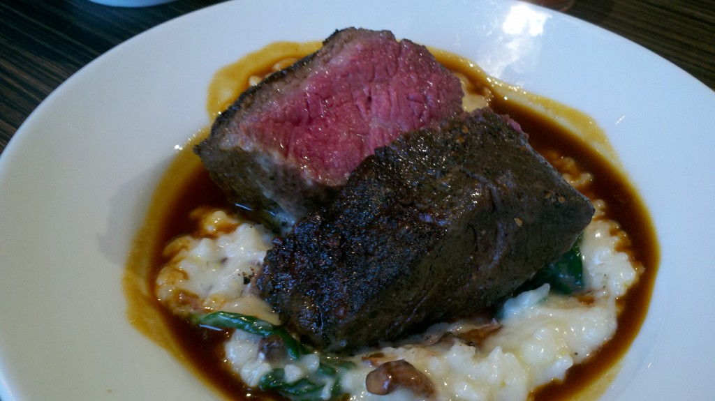 About 6 ounces of Waygu tri tip which appeared to be seared using a pan sautée baste, leaving the exterior 1/8 inch dark drown and saturated in a juicy flavor. The rest of the cut was left rare. My guess is that it was cooked to about 135 degrees (130 is very rare and very bloody and 140 and rare and red throughout and just dripping some blood). A tad under cooked for my taste, although the flavor of the tri tip was spot-on with natural beef flavors taking center stage. The tri tip was served atop a chanterelle mushroom risotto. The rice in the risotto was cooked perfectly with a very subtle resistance and creamy flavor or the chanterelle broth imparting a lasting impression. I appreciated the pairing of the Waygu and the risotto; very complimentary flavors.