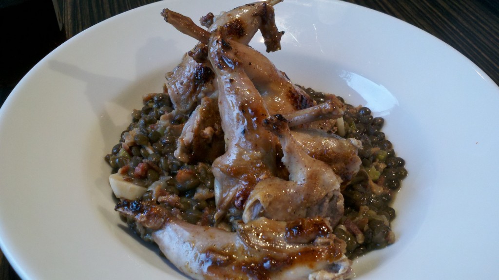 An assortment of grilled quail thighs served with lentils and bacon. This pleasantly gammy meat has a more assertive flavor than chicken thighs and a texture that is closer to duck. No more meat on these quails than a large chicken wing, but they made up for it in flavor. If you have never tried quail, give it a shot. I really enjoyed the lentils with bacon; great balance of earthy flavors that were amped up with the more aggressive flavors of fatty meat. The lentils paired nicely, because by themselves lentils can have a flat earthly flavor, although when accentuated with gammy quail meet and fatty bacon, it makes for a nice combo.