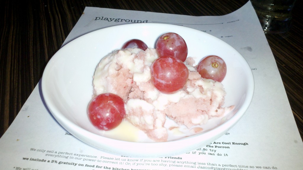 “ Woahhh, it takes like a grape,” said my brother Mark after taking one bite. This dessert was an interesting experiment that was nicely executed. Red globe grapes are converted into a very sweet sorbet by using just grapes and water. It was topped with sweet condensed milk. A wonderfully red grape flavored sorbet that is very sweet and uses no additional sugar. The sweet condensed milk hugged the natural sugars, making the dish smooth on the taste buds. You should try this dish at least once.