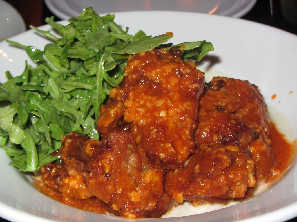 The Playground’s version of chicken wings. Pig tails are actually about the size of chicken wings and remind me of a combination of pig’s feet, chicken feet and a subtle nod to chicken wings. The pig tails appeared to have been crisped in a fryer and then leathered in a house made hot-sauce and Maytag blue Cheese combination. The wings were placed in a bowl in puddles of the hot sauce and house-made ranch dressing. This dish was both meaty and fatty and it pushed the envelope. I liked it!