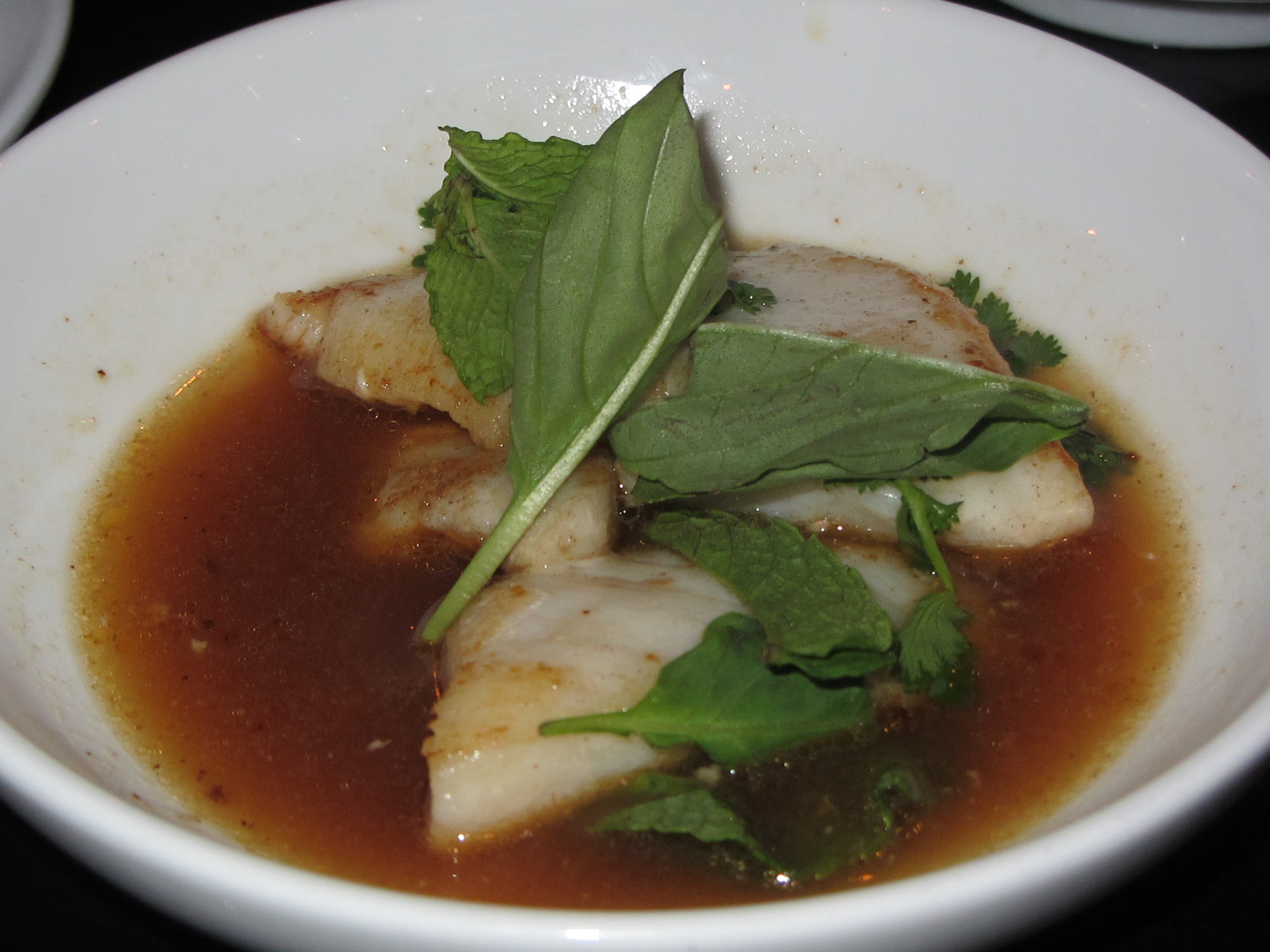 This delicacy is prepared by simmering down beef tendons into a rich broth and then poaching the halibut cheeks in this sauce. The results are lush and delicate halibut cheeks. The flavor might remind you of a very refined woman who has a slutty side. The dish was very delicate and refined, but carried extremely rich flavor and a pleasant aroma. This dish was small, but very much worth the experience.