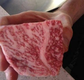 Five cuts of Waygu beef are ground in-house to make a very fatty burger patty at 40% fat. Waygu is already a fatty cow, but cherry-picking your cow parts provides the ability to control flavor, fat content and texture. The cuts include rib-eye, tri-tip, brisket, shoulder and short-rib. Patties are formed in a special technique to ensure that the patty is very fluffy. This fluffiness ensures a pleasant texture when cooked. The burger is laid up on a freshly baked horseradish laced bun and dressed with onions stewed in maple and bourbon, shredded lettuce, house-made mayonnaise and mustard.