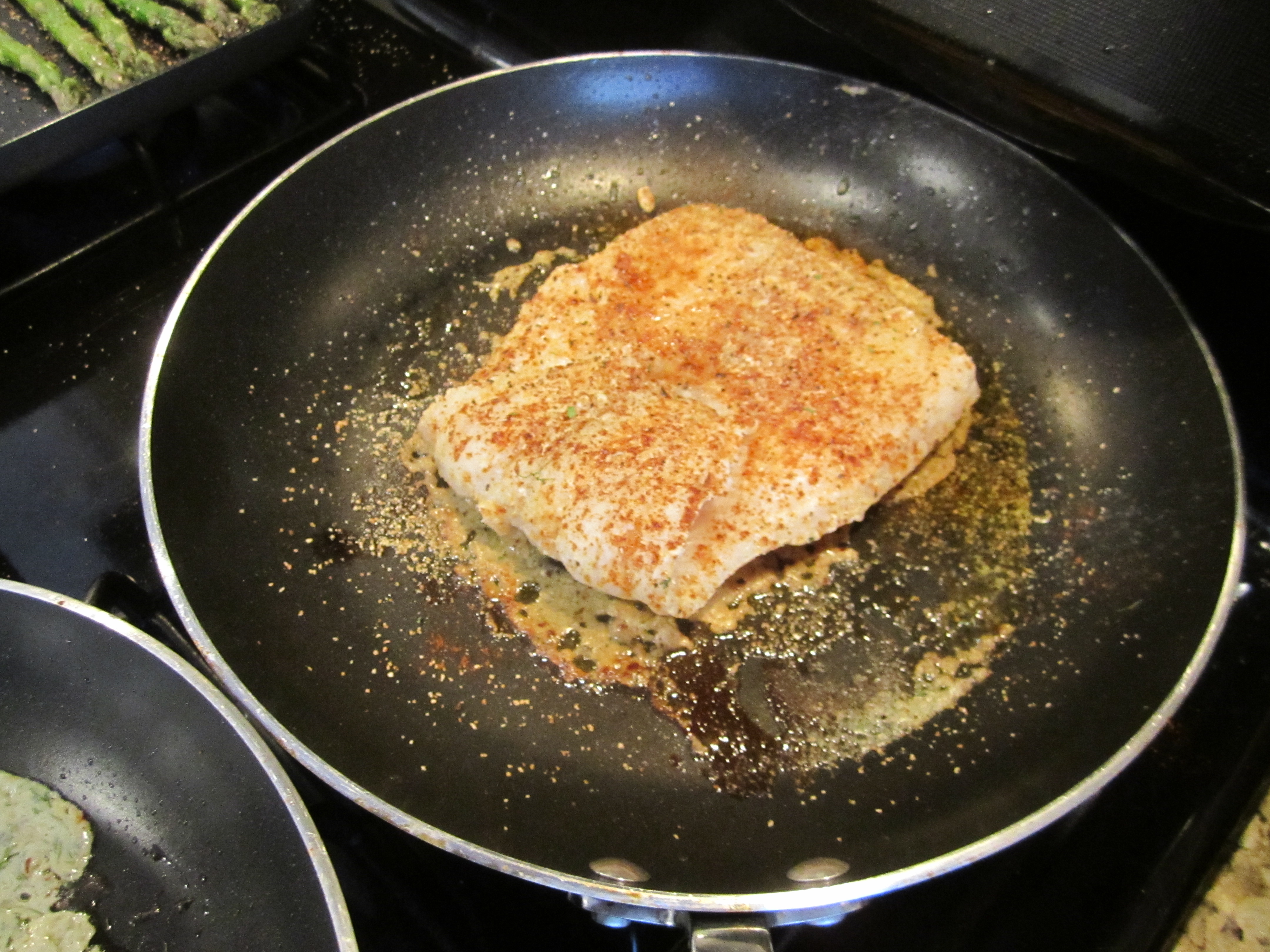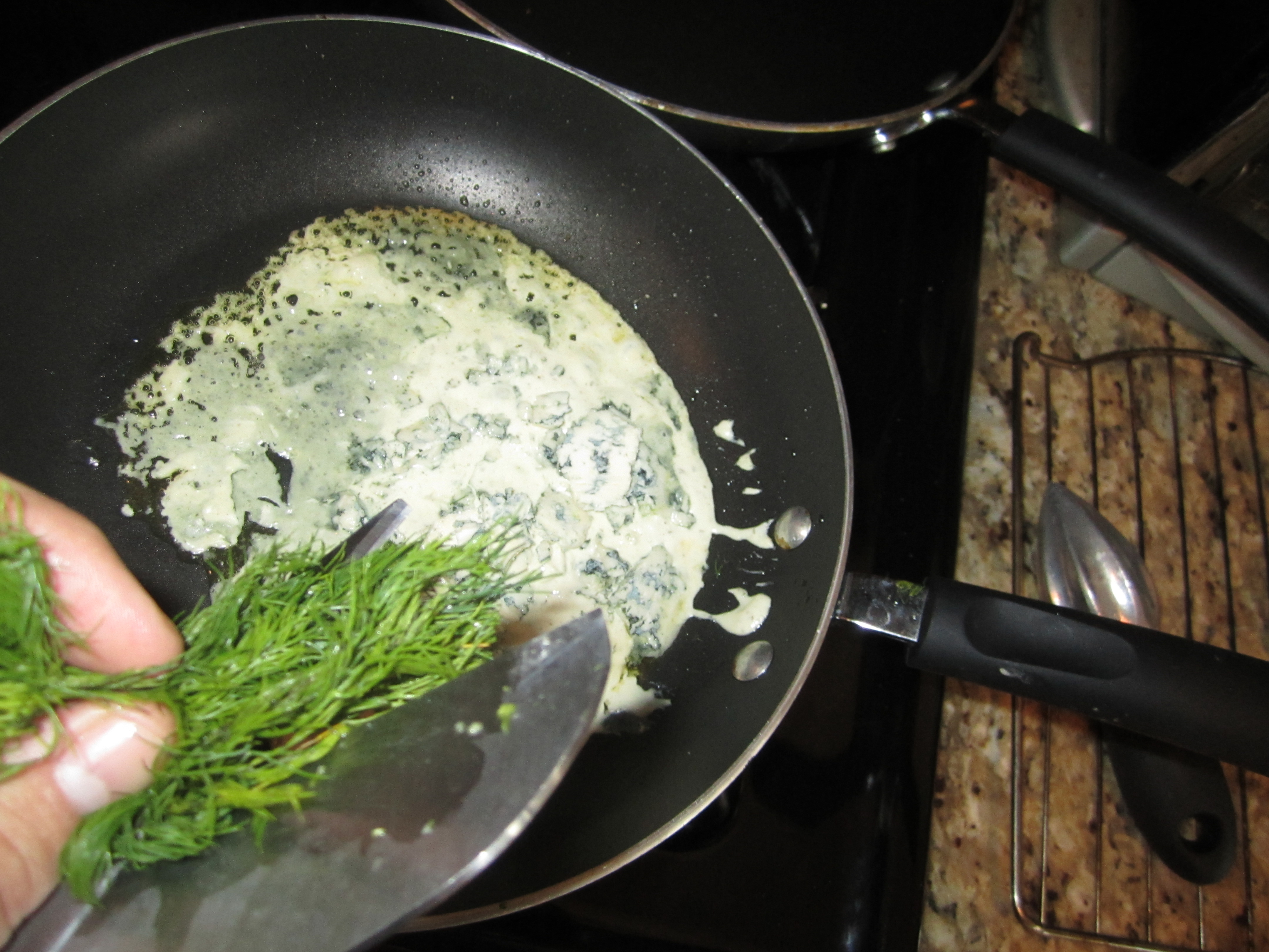 Cheese (or make your own with your choice if Italian herbs and plain cream cheese). As it melts in the pan, add thin slices or crumbles of fresh blue cheese, and dill. Once the cheeses melt in the pan, mix in lemon juice to taste (3-5 tablespoons) and then the OJ, about 2 tablespoons. The Lemon juice and OJ matches the fish and reduces the punginess of the blue cheese. If you have a open bottle of Chardonnay open throw a spritz in the pan as well. Dont forget to take a swig for yourself, you earned it beautiful.