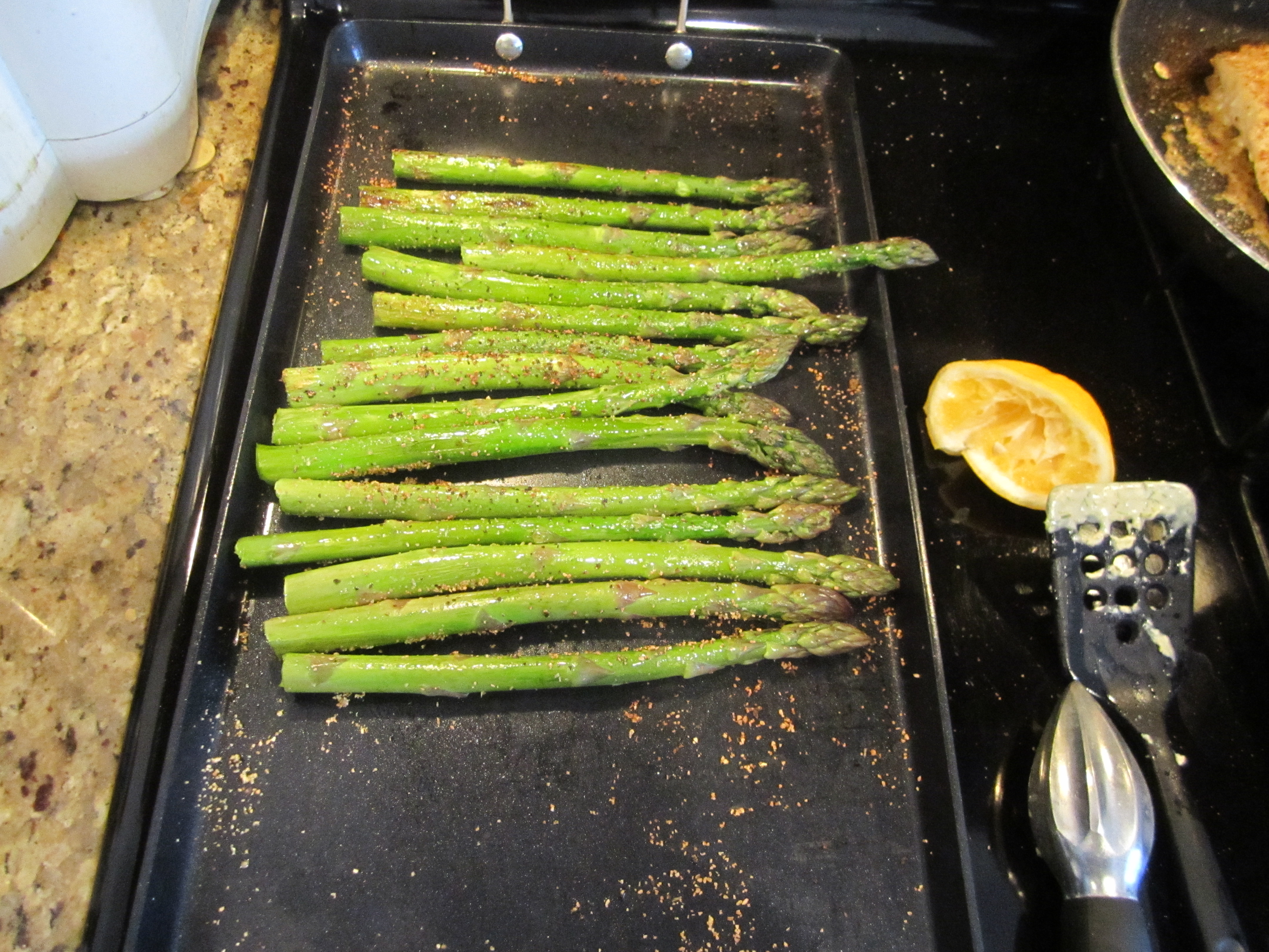 First step is trimming the asparagus base about 1/2 inch and coat lightly with Olive Oil and season with pepper, salt, garlic powder and fresh squeezed lemon juice. Next, warm up the griddle medium low and then place the asparagus to slowly cook on one side for 8 minutes, until heavily browned.