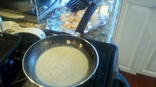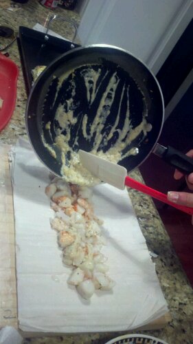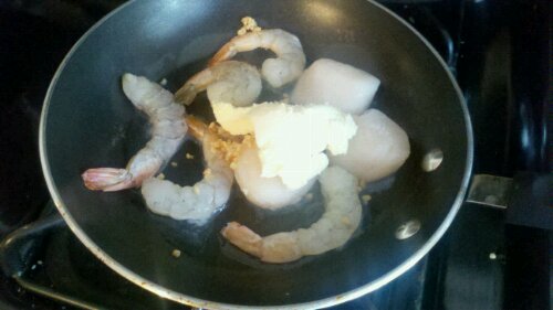 Start of the Seafood Faux Wellington. Frozen Shrimp, Scallop, lemon juice, yogurt butter, garlic. Cook down the reduction of fish juices,and the before mentioned ingredients. I also at this point warmed up the imitation lobster (I had to use it up from a previous dish)