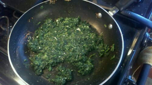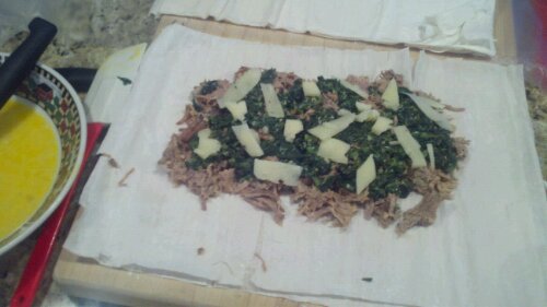 Layered Tri-Tip Mixture, then Spinach and then small slices of black truffle cheese