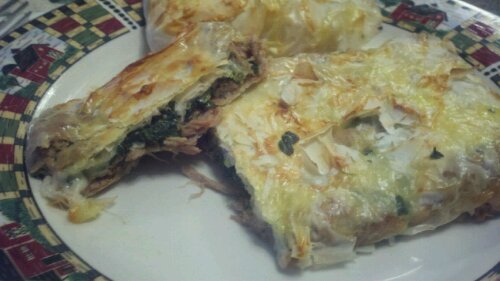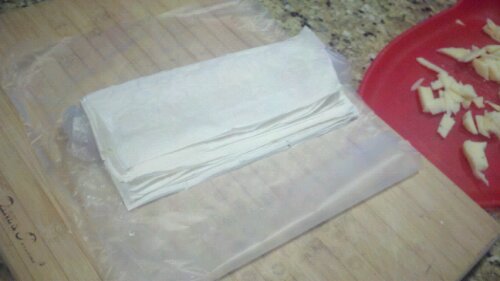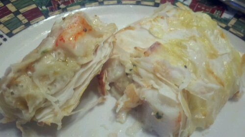 Add more Lemon Juice, teaspoon of cream cheese, handful of grated parmesan. Bring to a full boil and then remove from heat...coolAssemble all the seafood on another Phyllo