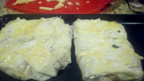 Folded the phyllo over into packets and rubbed down in an egg bath. Placed on a roasting pan.