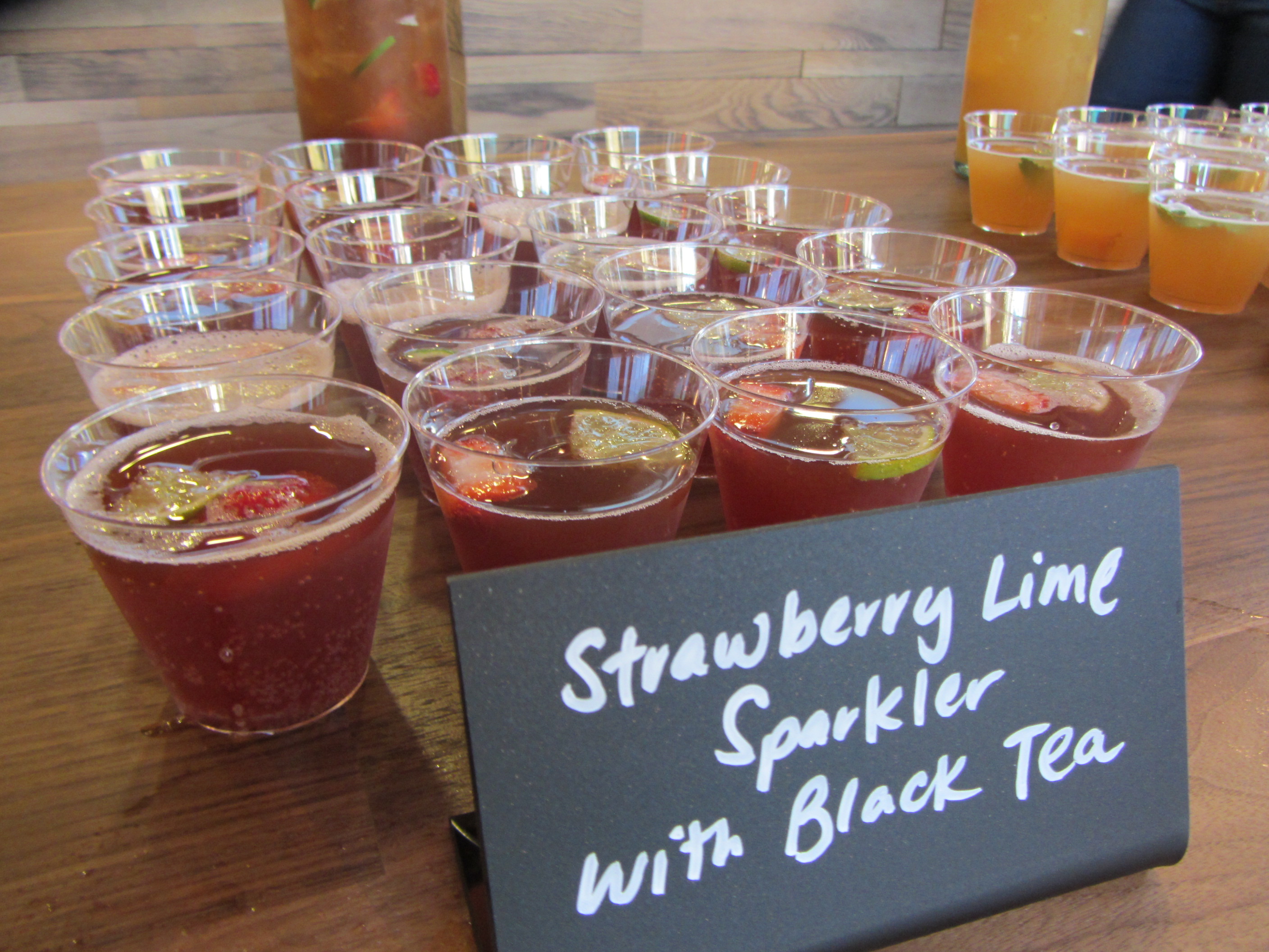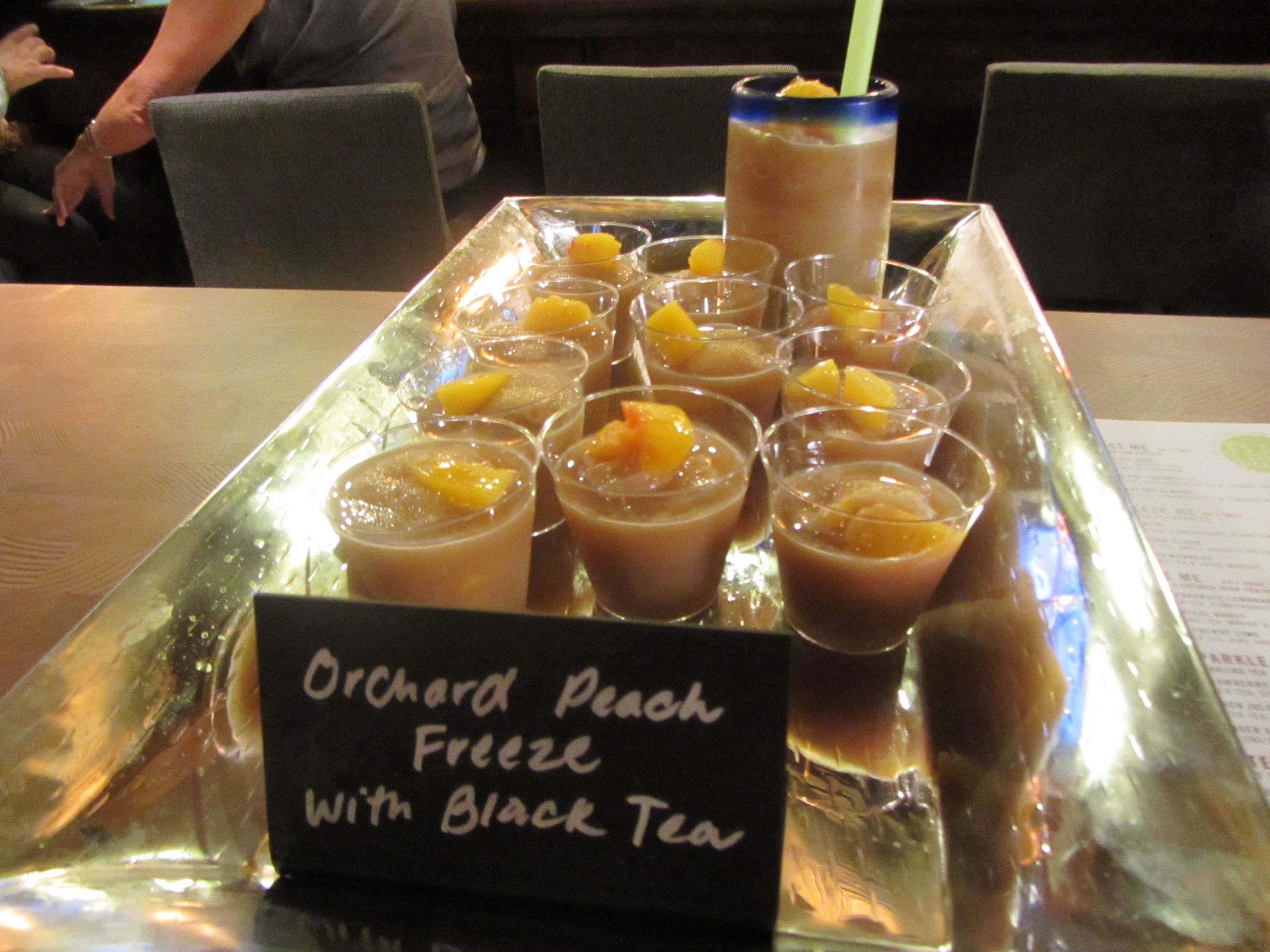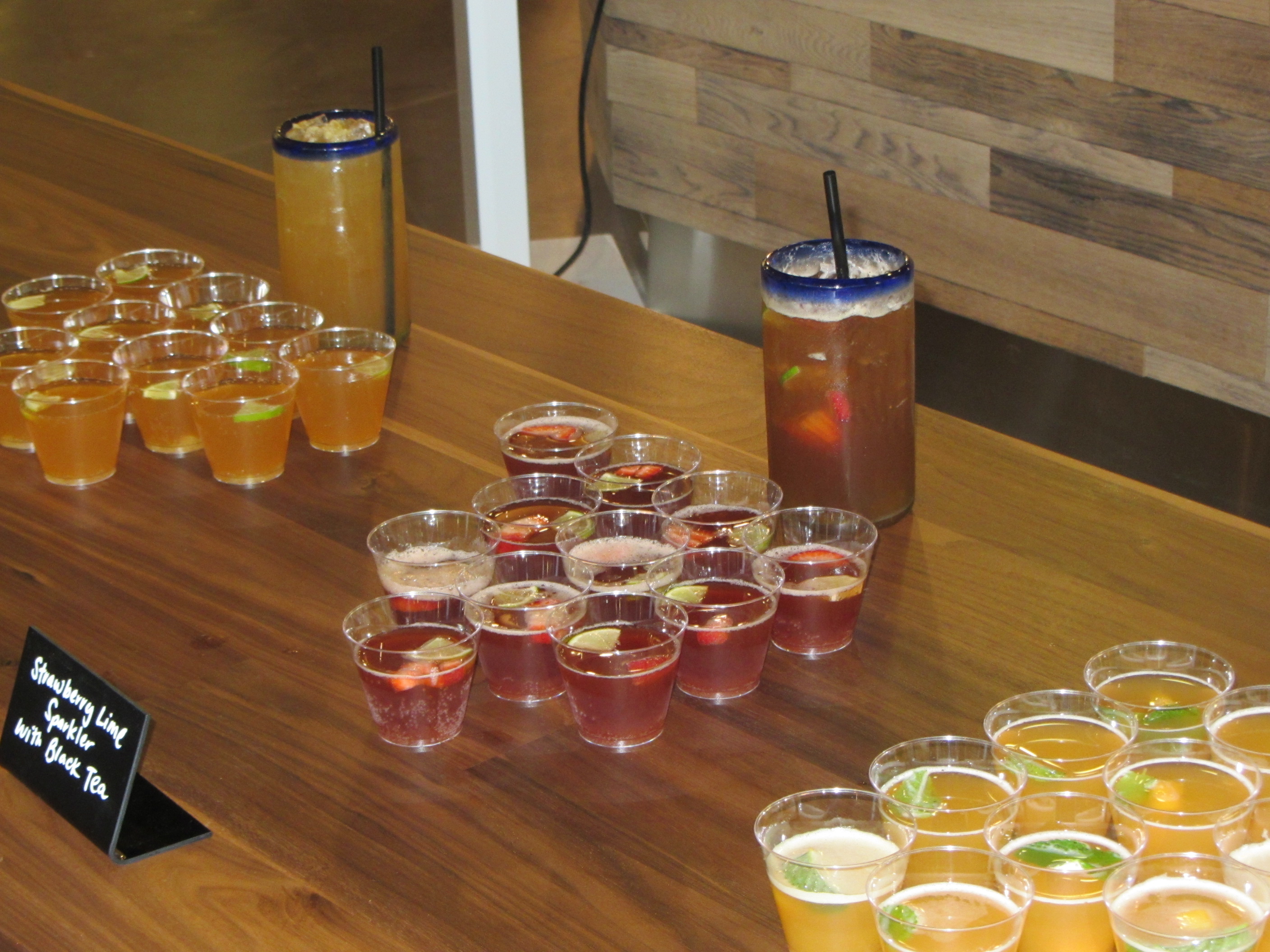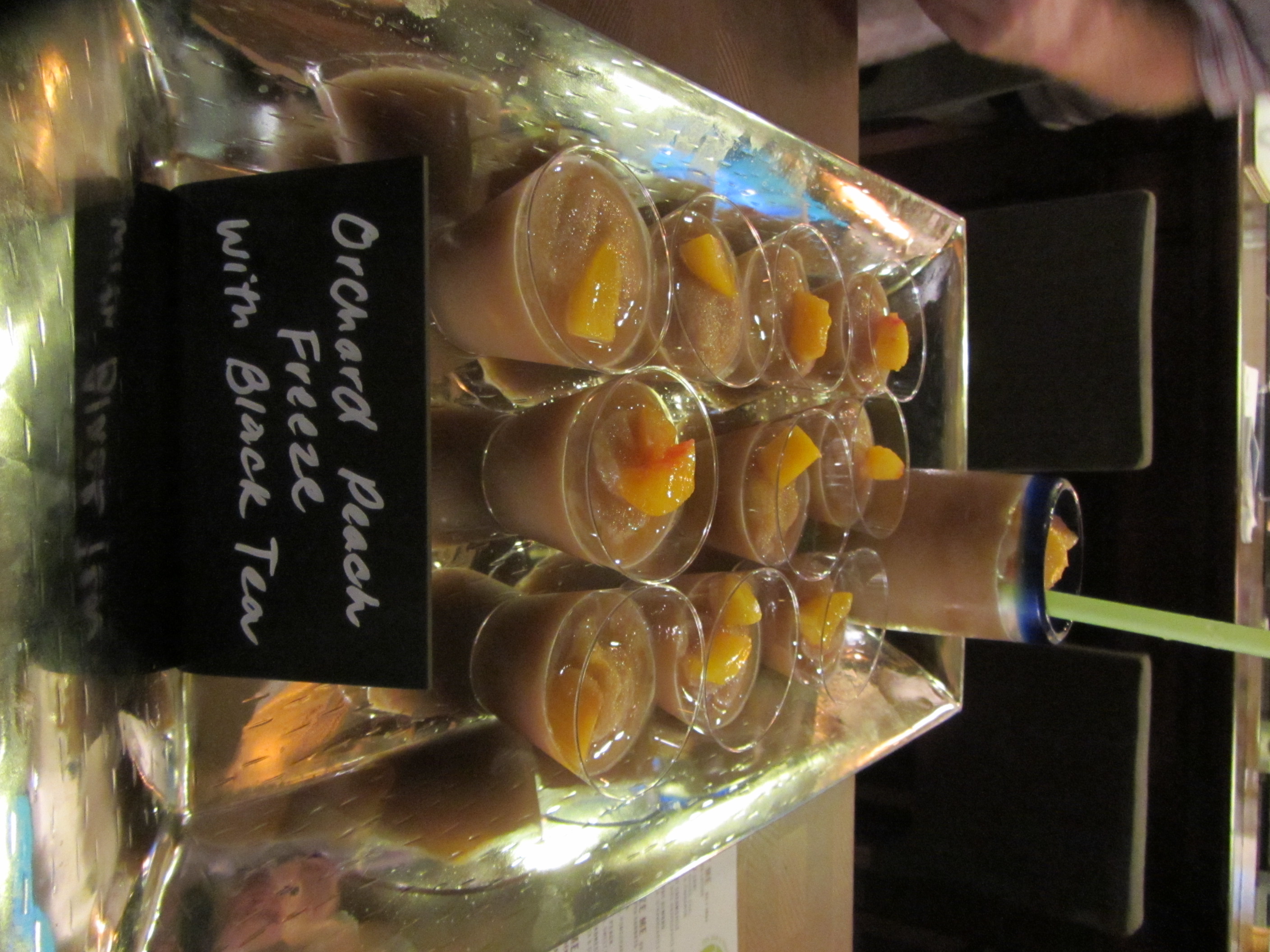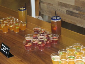 Whole Foods’ Beehive Tea Market is a tea-centered bar at the front of the store. Their drinks are based on teas like black or oolong and are infused with a blend of fresh organic fruits. For example, I tried about four of the tea based fusion drinks. My favorite Iced Tea was the Strawberry Lime Sparkler, made with Black Tea, Strawberry and Fresh Lime and a sprtiz of something effervescent. This drink was very refreshing a light, perfect for sitting on the patio.