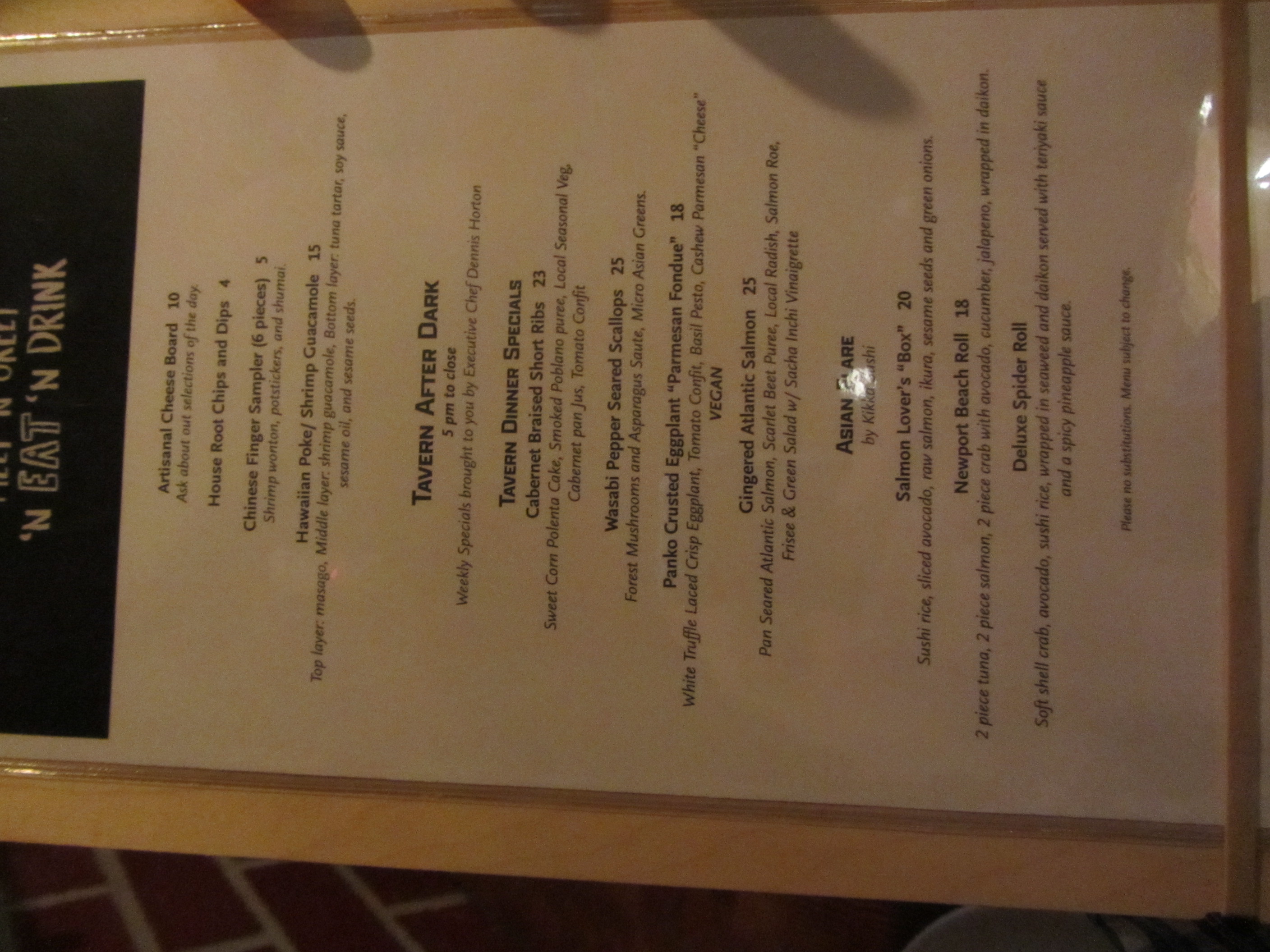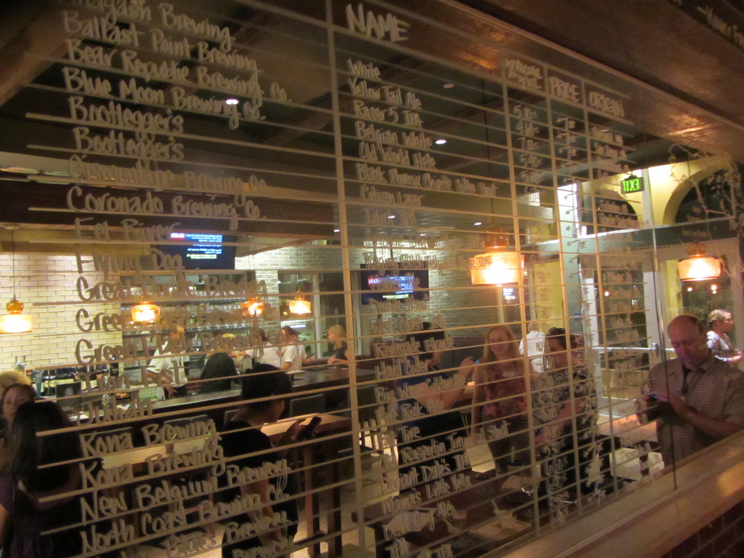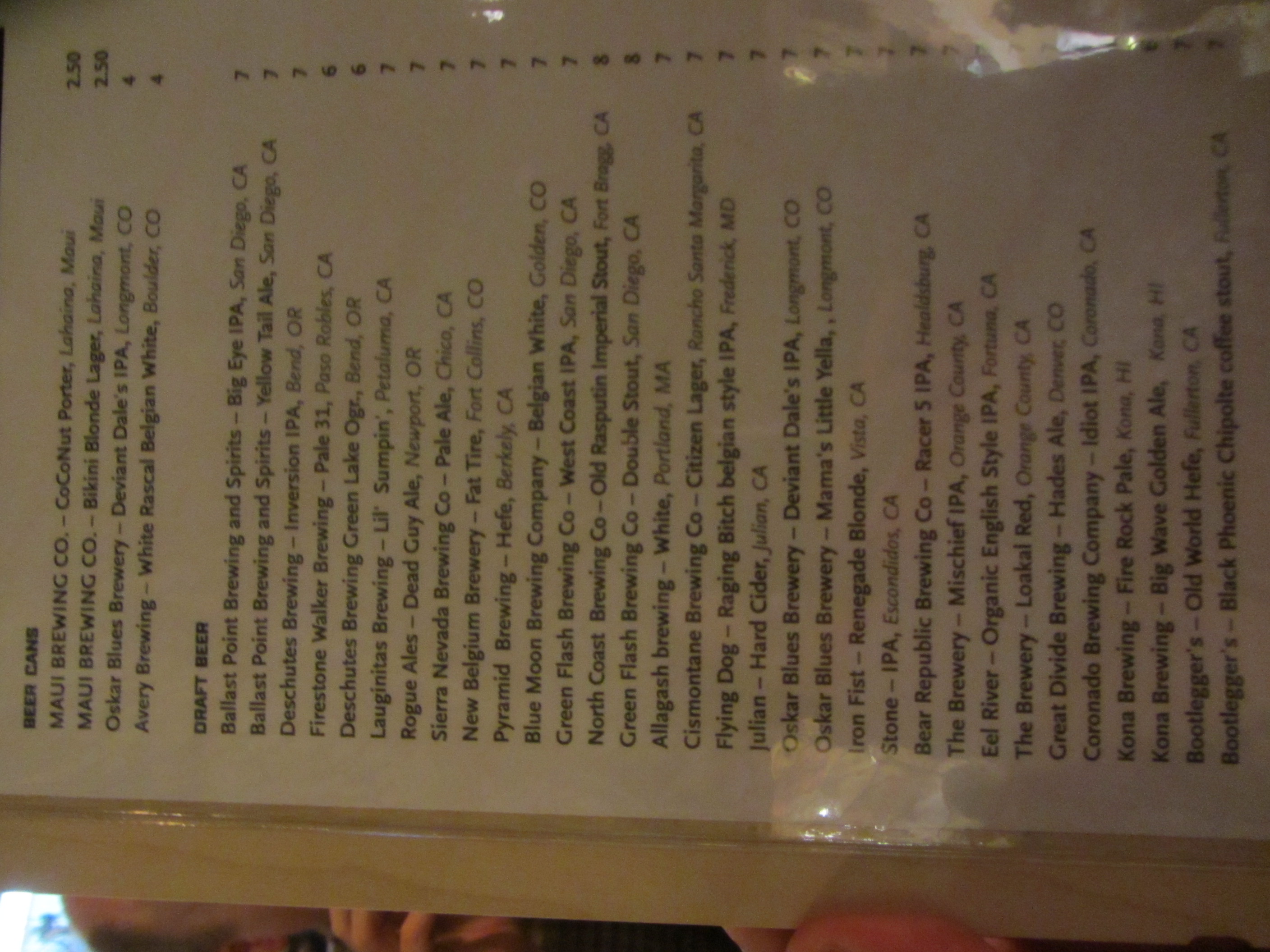 In addition to the food, they featured a very impressive selection of draft micro-craft brews, many from local breweries. Some of the better beers that I noticed included Allagash Brewing (Portland), Ballast Point (San Diego), The Bruery (Orange County), and Bootleggers (Orange County). The wine list was also pretty impressive, and featured a variety of price points. Some wines that stood out included a buttery Chardonnay by Rombauer and Hitching Post Pinot Noir from Santa Barbara.